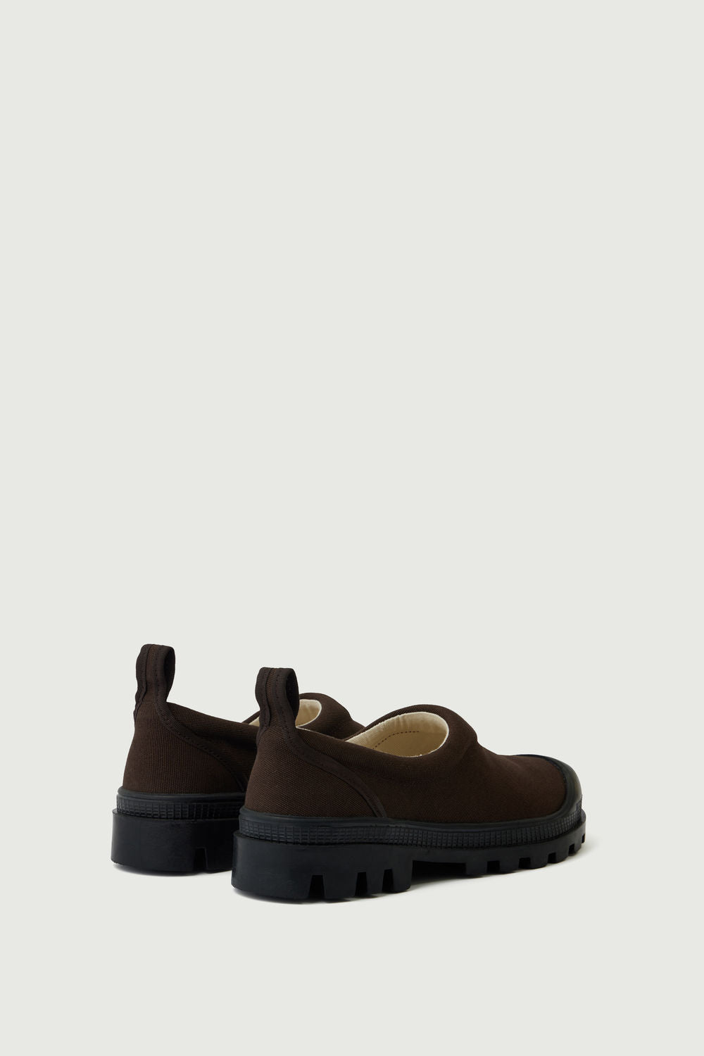 - Brown canvas ankle boots with black rubber tread soles