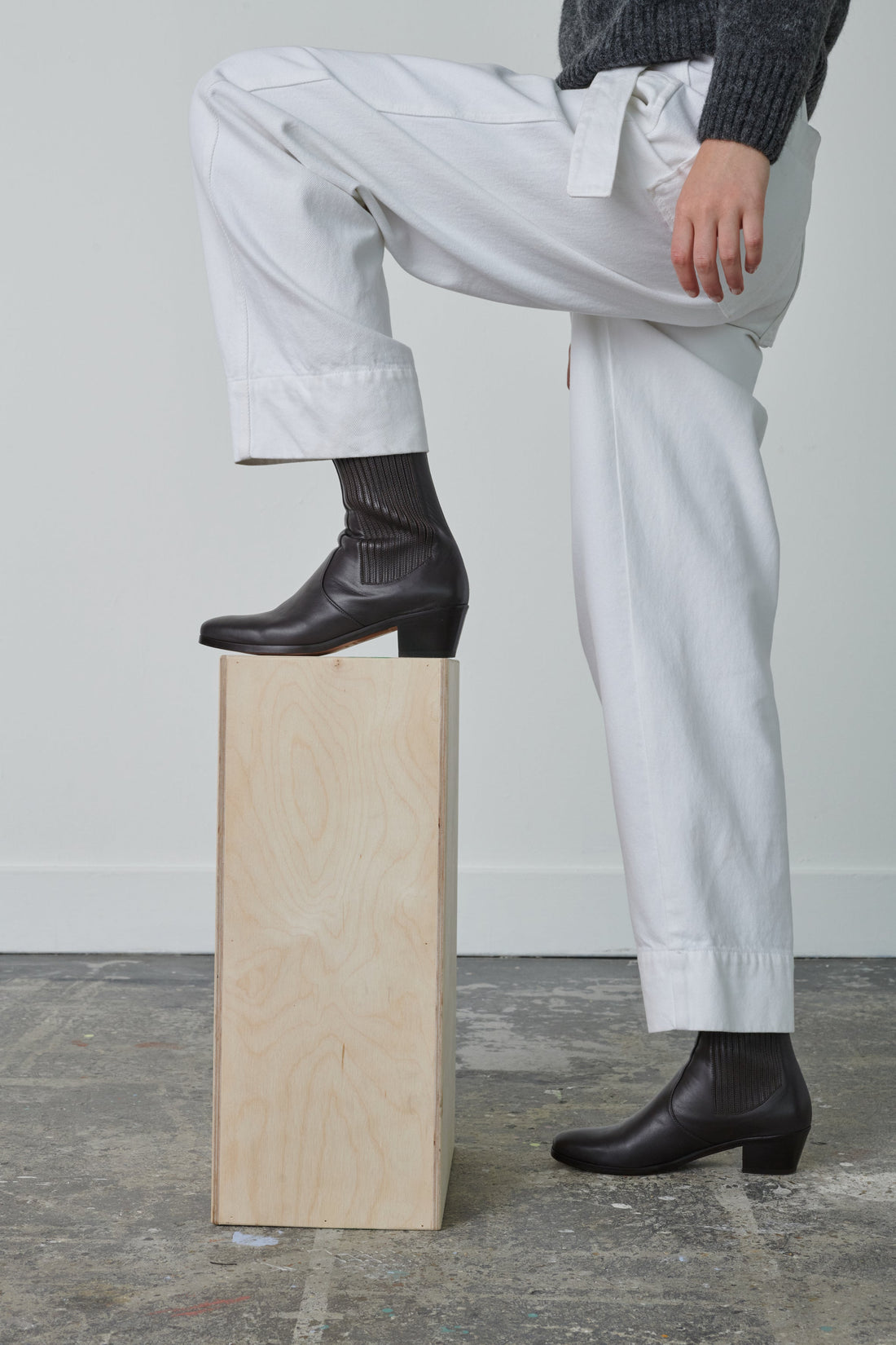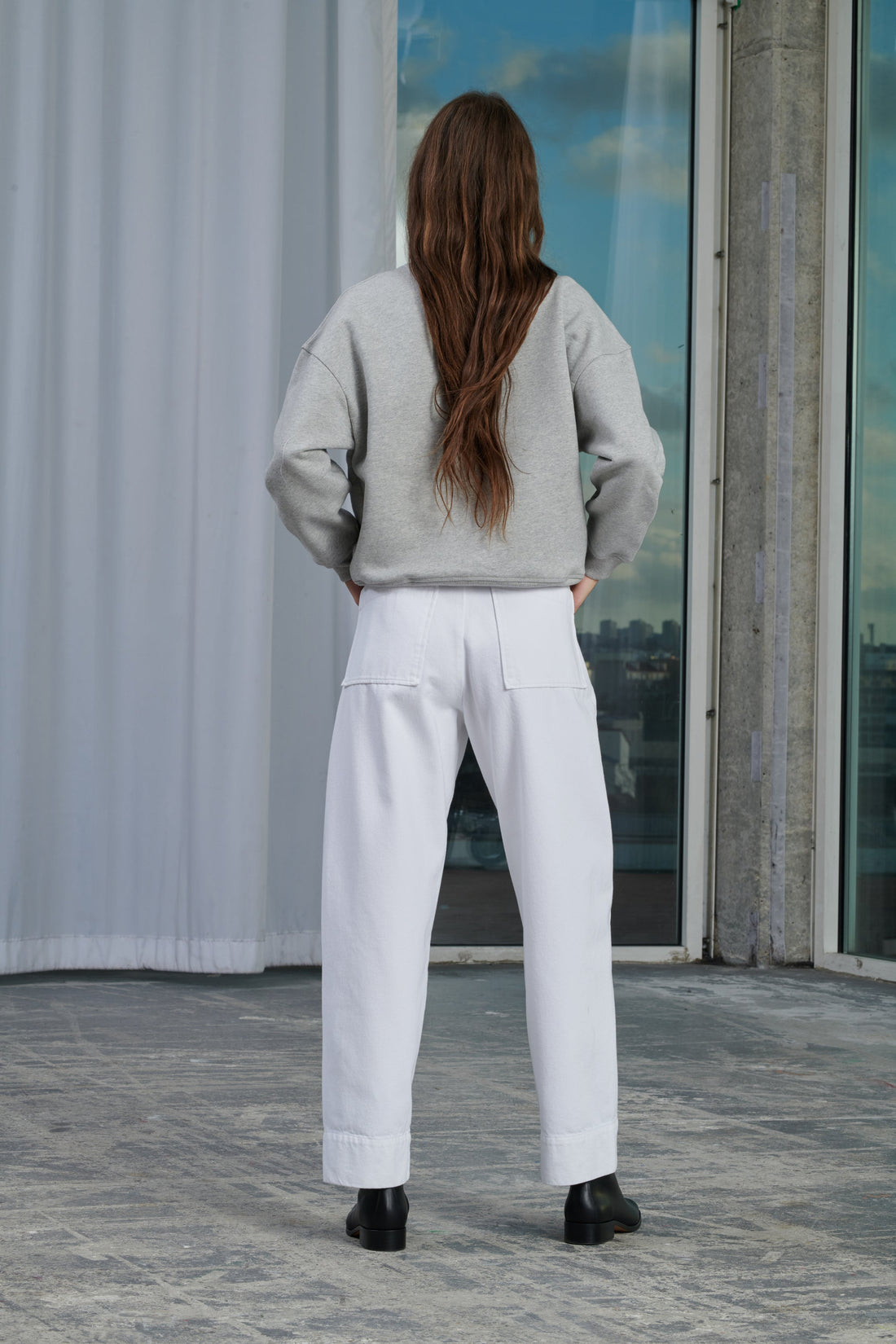 White denim high-waisted trousers - Slightly curved cut- Removable belt with double buckle- Two back patch pockets- Hook and loop fastener on the inside of the belt