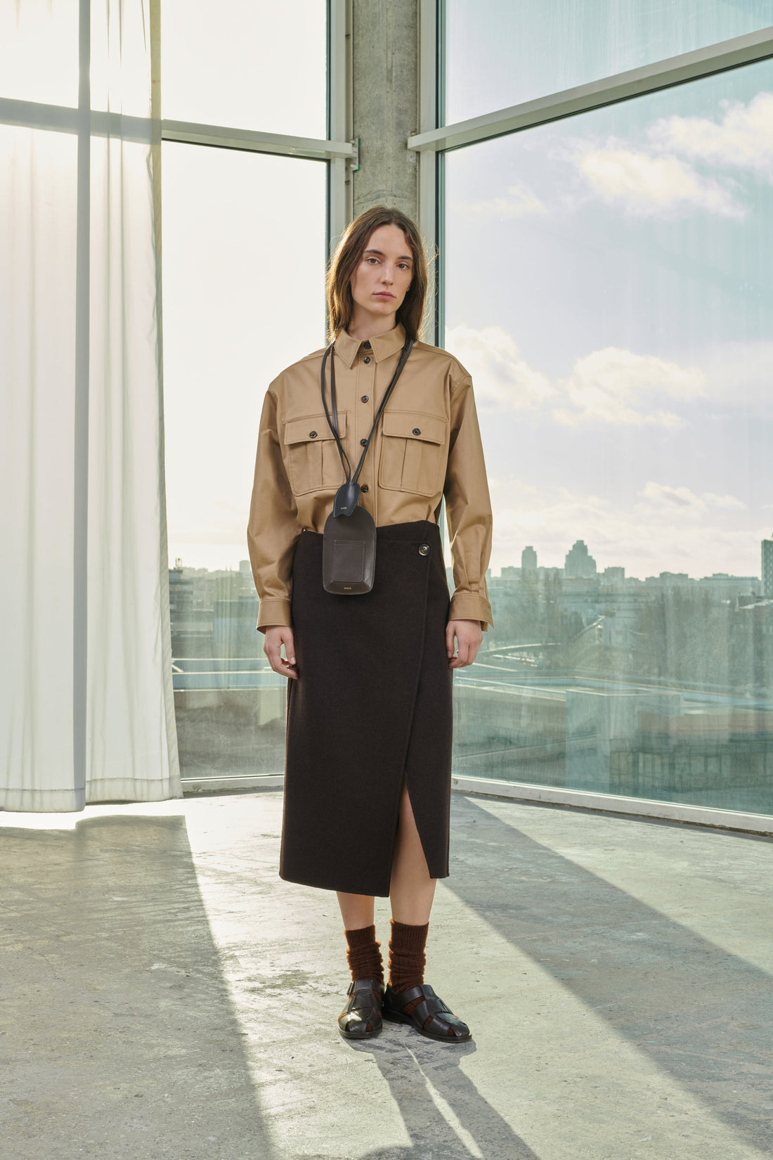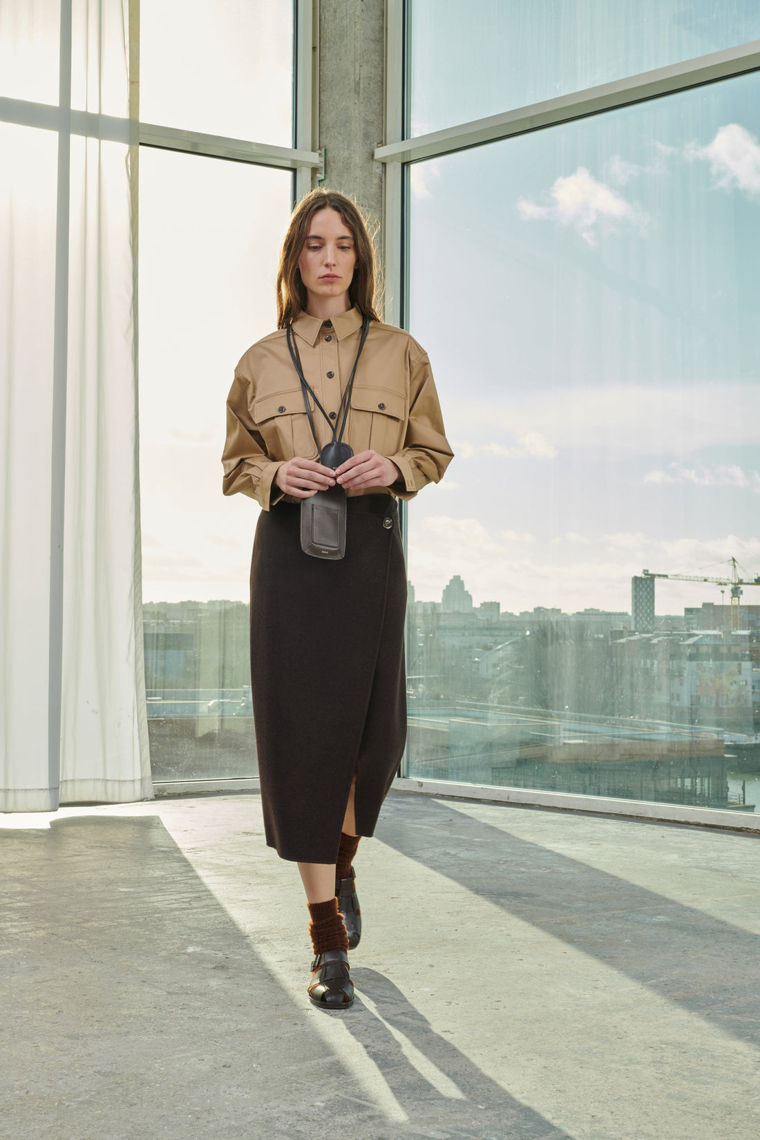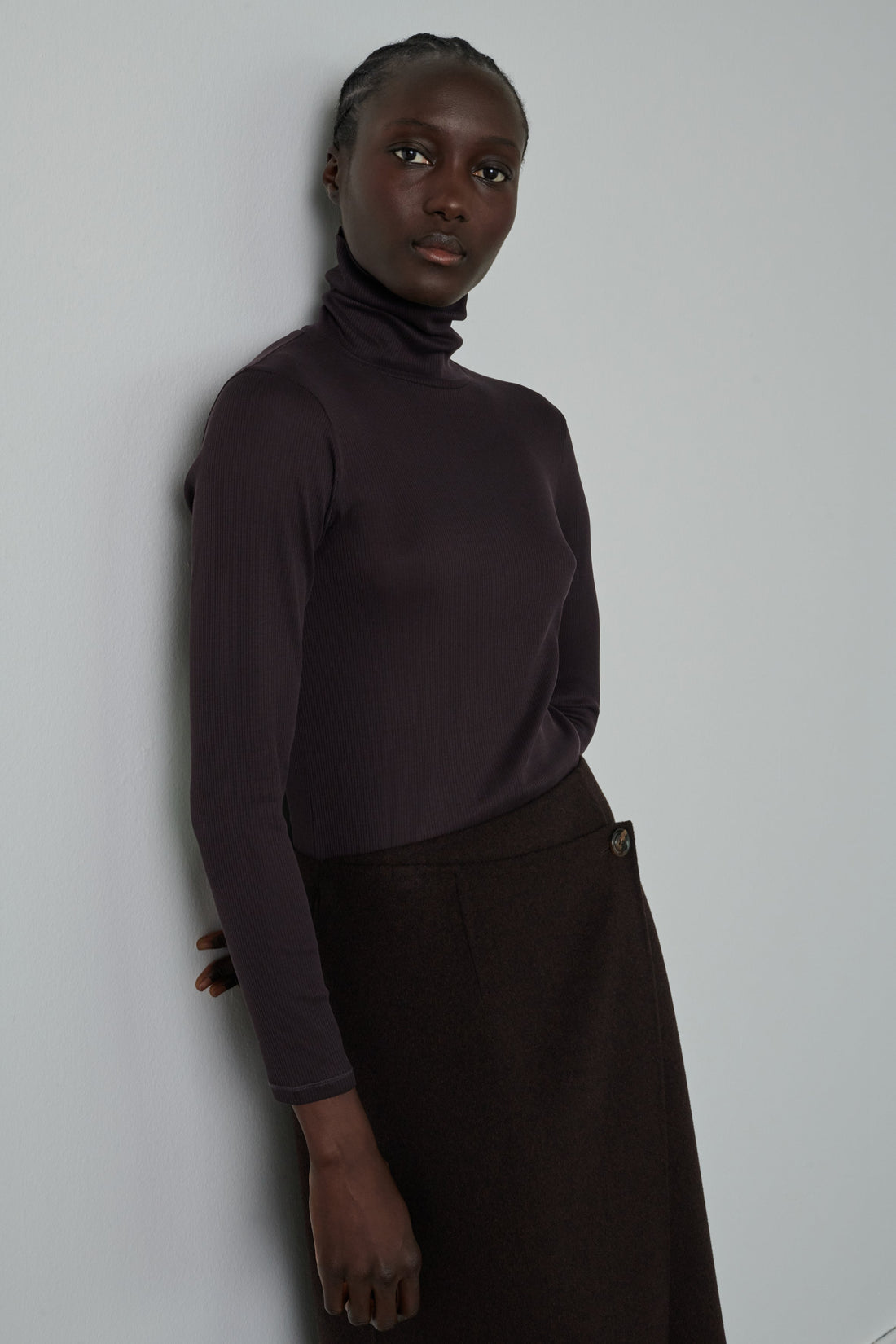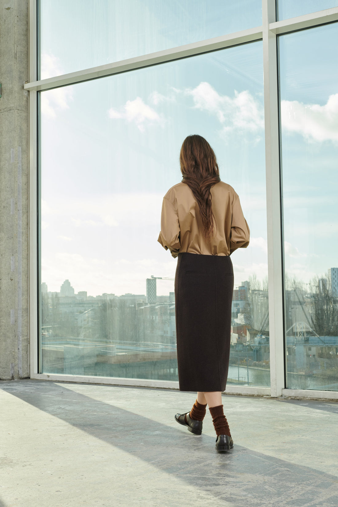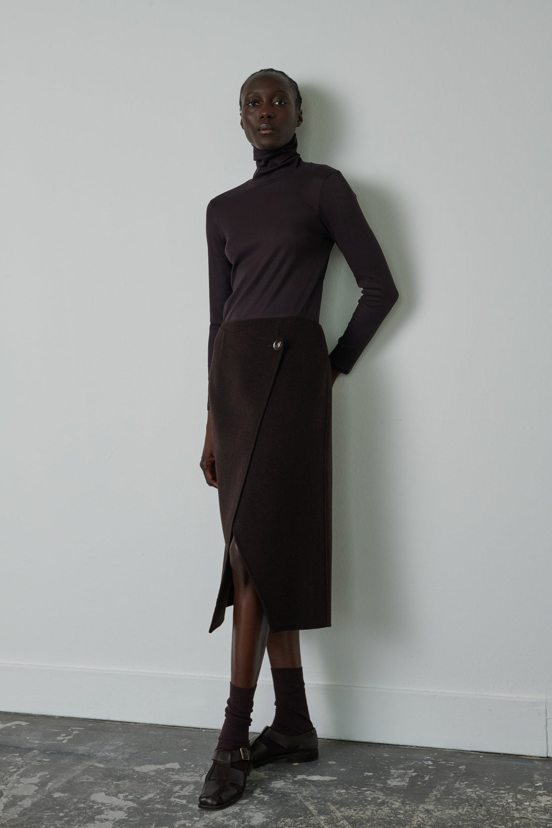 Asymmetrical double-sided wool wrap skirt mottled brown